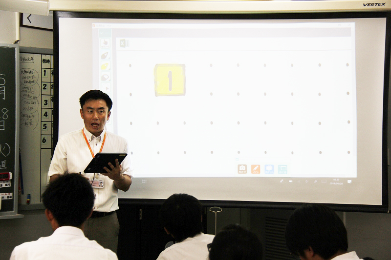 生徒が自ら作成した資料を学習用端末を通して画面を表示し、プレゼンテーションを効果的に行います。